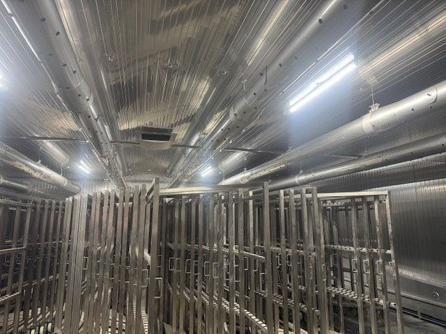 Для строительства мяскомбината «ПрофХолод» произвел 2 367 кв. метров стеновых сэндвич-панелей с PIR Premier. Одна часть панелей с внешней стороны изготовлена в сигнальном белом цвете RAL 9003, с внутренней – из пищевой нержавеющей стали AISI 304. Другая часть панелей с внешней стороны изготовлена в сигнальном синем цвете RAL 5005, а с внутренней стороны в белом цвете RAL 9003.